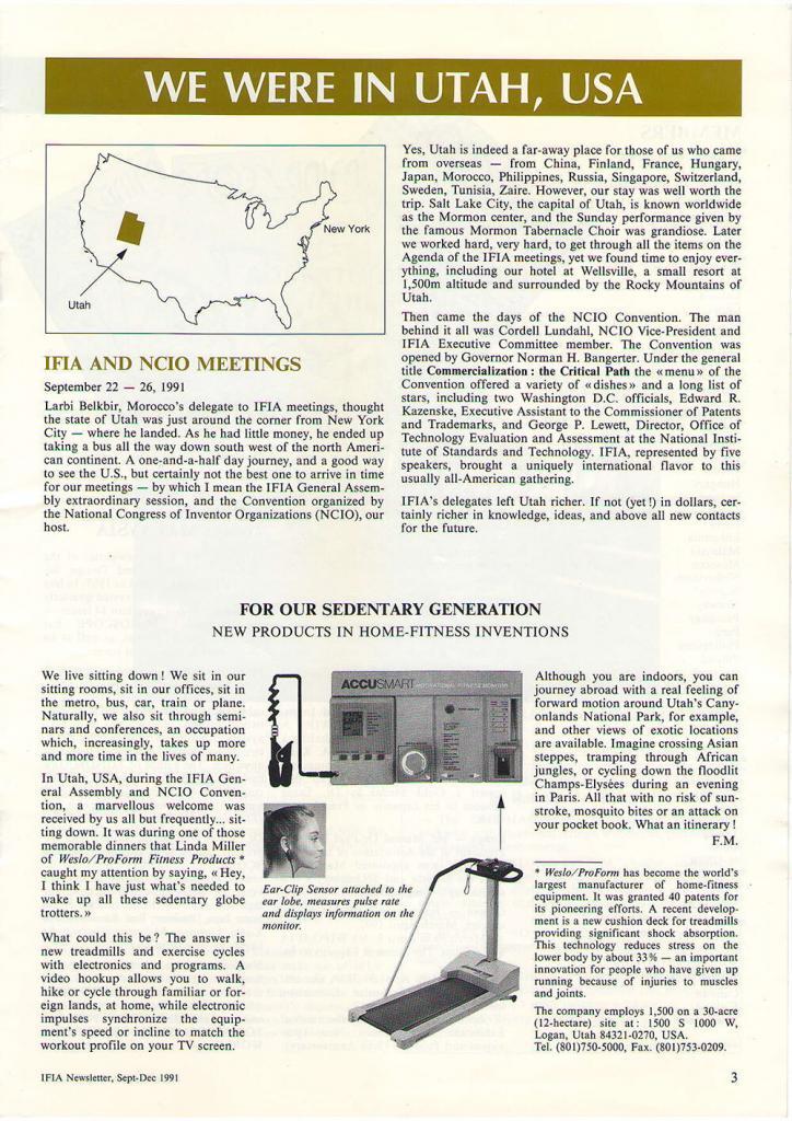 As early as 1991, IFIA’s official newsletters documented and highlighted significant advancements in home-fitness and sports-related inventions, including innovations in treadmill technology, stationary bicycles, and electronically enhanced training systems. These developments were not merely consumer products; they represented patented technological solutions designed to improve athletic performance, reduce physical strain, and make professional-grade training accessible to the public. By showcasing such inventions within its international network and conferences, IFIA actively contributed to the promotion and visibility of sports-related innovation.